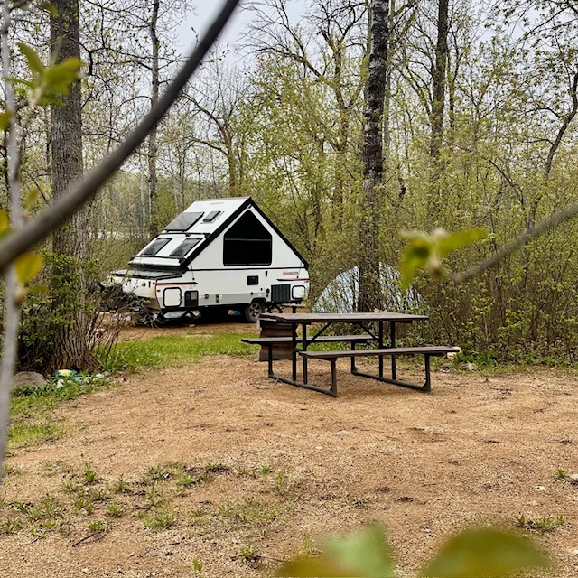 Site 7 is a private site located near the walking path to the boat launch. The site is gravel covered and provides a lot of tree cover.
