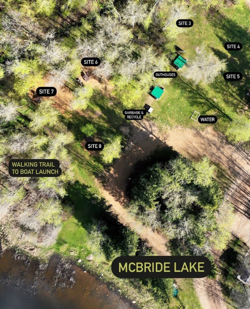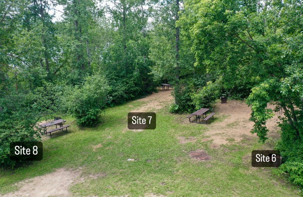 Each site includes a fire pit, a free bucket of wood and picnic table.