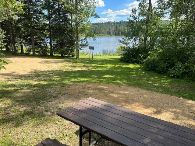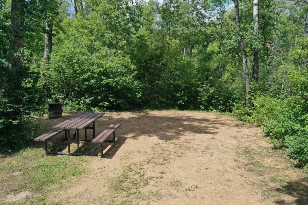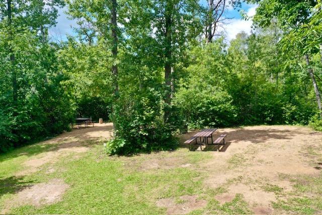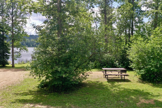 Site 6 is a private site located near the outhouses. Partial views of the lake from this well treed, gravel covered site.